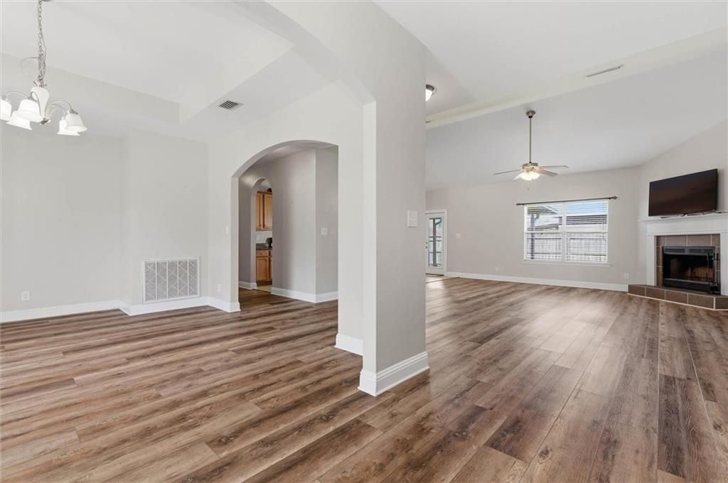 Welcome to Chesterfield Place, this 3 bedroom, 2 bath home featuring an impressive open floor plan that is perfect for entertaining or enjoying time with family! From the moment you arrive, you'll appreciate the inviting front porch and the covered rear porch overlooking a fenced backyard - ideal for relaxing or hosting gatherings. Inside, the spacious floorplan features vinyl plank floors throughout the main living space.. The kitchen features beautiful stained cabinets, ample countertop space for cooking and meal prep, and ceramic tile flooring in all wet areas. The living room showcases a vaulted ceiling and a cozy wood-burning fireplace, while the formal dining room features an turtleback ceiling. The oversized primary suite is large enough to offer a sitting area, creating the perfect private retreat. The en-suite bath features a garden tub, separate shower, and double vanities. All bedrooms include full walk-in closets, and the home offers additional hallway storage closets for added convenience. Outside, the fenced backyard also includes a storage building, providing extra space for tools, lawn equipment, or hobbies. Don't miss your opportunity to own this fantastic home -schedule your showing today before it's gone! All measurements are approximate and not guaranteed, buyer to verify.