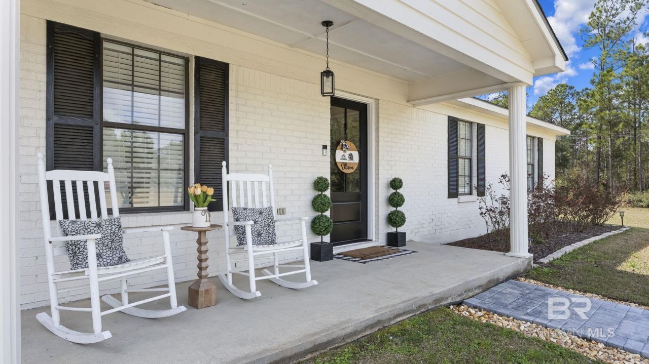 Nearly three private acres. Fully remodeled. Less than 30 minutes from the coast. This full-brick ranch on a corner lot in Elberta gives you room to breathe, modern updates, and a laidback lifestyle that's hard to find. From the moment you pull in, the white painted brick exterior and blooming landscape feel warm and welcoming ? the kind of place that instantly feels like home. Step inside to an open concept main living area with luxury vinyl plank flooring, fresh paint, and all-new lighting throughout the entirety of the home. Exposed wood beams on and a bold accent wall anchor the main living area, while the kitchen shines with stone countertops, white cabinetry, breakfast bar, tiled backsplash, a pantry, and brand-new appliances ready for everyday life or weekend hosting. A separate office with a barn door adds flexibility for whatever type of bonus room you may need, while the spacious full-sized laundry room offers everyday convenience. Both bathrooms have been fully refreshed with updated vanities, fixtures, and a clean, cohesive design that feels polished and move-in ready. Out back, the covered patio overlooks a backyard with room to roam, garden, entertain, or simply unwind. A paved drive, double carport, garage storage, and new water filtration system add everyday practicality. Just minutes from downtown Elberta, local favorite Pirate's Cove, and the Gulf's white-sand beaches ? this is where space, comfort, and convenience finally come together. Buyer to verify all information during due diligence.