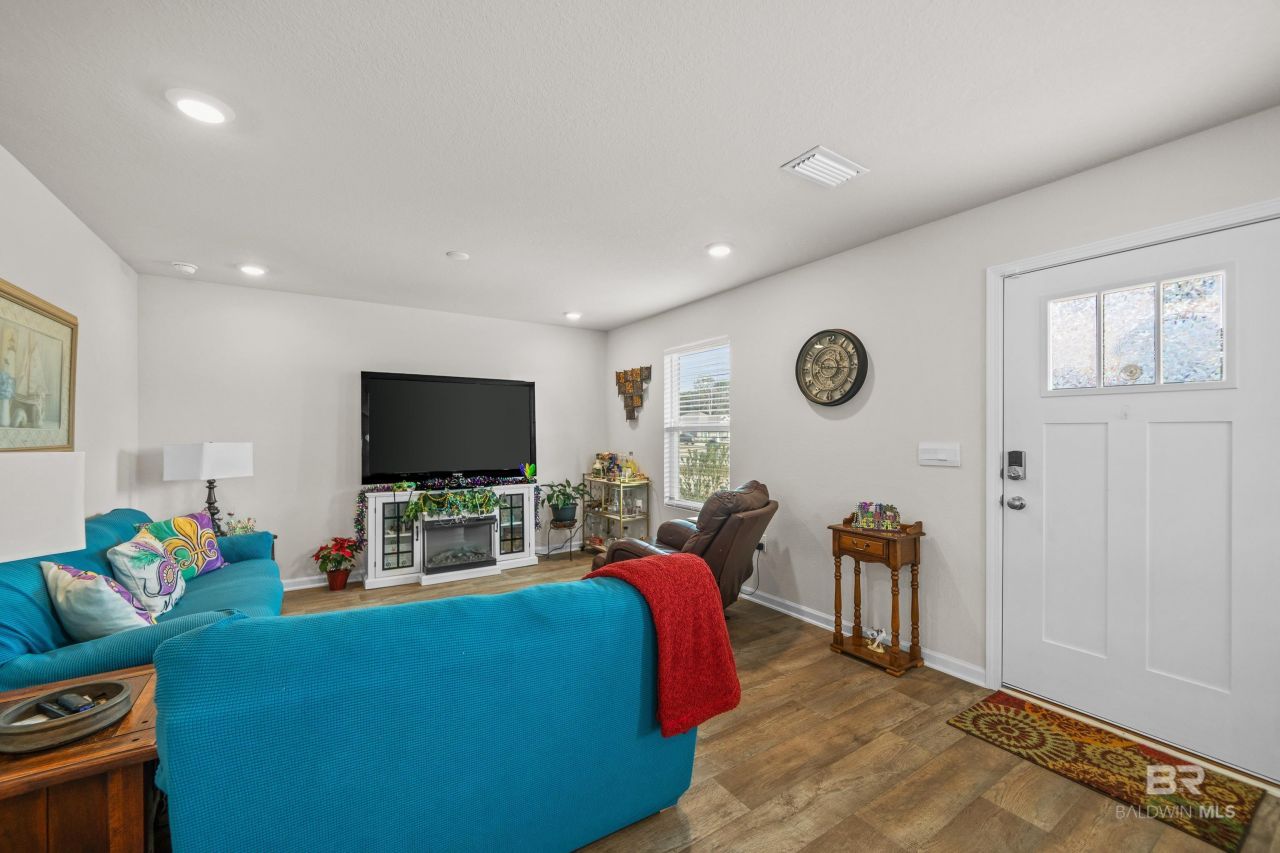 Set in the Bay Street Villages community in Foley, 1137 Sweet Laurel St offers a newer home option with easy access to both daily conveniences and local attractions. Located just minutes from downtown Foley, you'll be close to parks, schools, the hospital, dining, and shopping, including Tanger Outlets. Entertainment at OWA is nearby, and the beach is just a short drive away when you want to spend time on the coast. Built in 2024 by D.R. Horton, this Gold Fortified home features 3 bedrooms, 2 bathrooms, and approximately 1,205 square feet of living space. Vinyl flooring and granite countertops run throughout the home. The open living area connects seamlessly to the kitchen/dining combo with stainless steel appliances and a practical layout for everyday living. The primary bedroom includes an ensuite bathroom with a walk-in closet, single vanity, shower, and linen closet. Two additional bedrooms share a full bathroom. Outside, the partially fenced backyard looks out over a pond, creating a calm outdoor setting, while additional features include a utility closet for washer and dryer, two parking spots in front of the home, and well-maintained landscaping. Buyer to verify all information during due diligence.