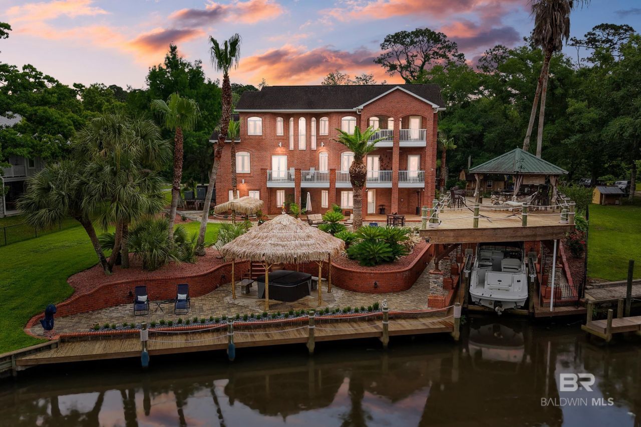 Exquisite three-story brick estate nestled in the bend of Fish River offering the perfect blend of timeless architecture and modern luxury. NO HOA!! Lush tropical landscaping and mature trees, this stunning residence boasts Panoramic Water Views, a private boat dock boathouse and a boat lift, and multiple outdoor entertainment spaces that evoke a private resort experience. From the gravel road, the gate opens and you pull up to the home on a paver driveway; get out of your car and walk up the beautiful brick stairs that leads to the decorative glass front door that welcomes you into a warm and welcoming home. Your eyes will immediately go to the high ceilings and then to the gorgeous view of the River. 3 BR 3.5 BT, each floor has its own bedroom and living/entertainment area. A 4th bedroom could easily be added. Newly Luxury vinyl plank floors installed, pre wired for a generator, deck was replaced in 2024, 10k pound boat lift. Double garage, large enough for up to 3 cars. Step inside to discover expansive balconies, large windows that flood the interior with natural light, and elegant finishes throughout. The outdoor spaces are a true showstopper?featuring a spacious multi-level patio, a charming tiki hut with thatched roofing, and a covered outdoor lounge perfect for relaxing or entertaining. Whether you're enjoying morning coffee on your private balcony, hosting guests by the water, or setting off on a sunset cruise from your dock, this one-of-a-kind home offers the lifestyle of your dreams. Features: ? 3 stories of elevated living space ? Private boat house & dock & lift with direct water access ? Lush tropical landscaping with mature palm trees ? Expansive brick patio with tiki hut and outdoor seating ? Multiple balconies with water and garden views ? Covered lounge and entertainment area ? Tranquil location with ultimate privacy. Live every day like a vacation in this exceptional waterfront gem! Buyer to verify all information during due diligence.