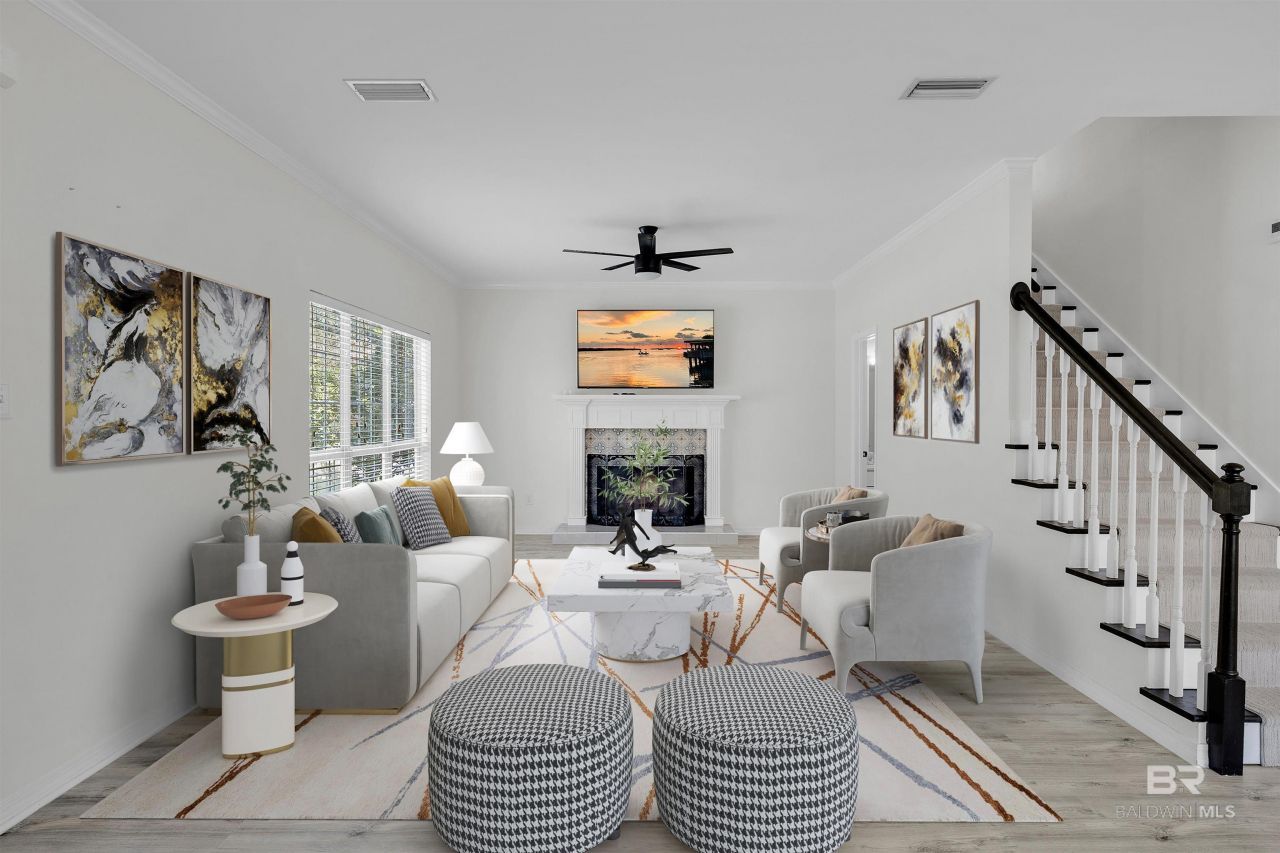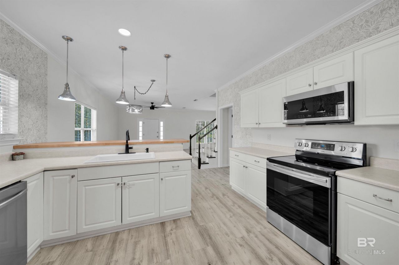 Take a look at this remodeled home situated on a spacious lot in the established neighborhood of River Mill. Conveniently located to shopping, schools and just 10 minutes from downtown Fairhope. The home sits on one of the largest lots in River Mill with an expansive front and back yard with mature trees and plenty of privacy. The home was remodeled with Farmhouse charm and has a great open floor plan that is both pratical and spacious. NEW fortified roof 2023! As you enter into the home notice the spacious open floor plan and the newer LVP floors that are throughout the entire home with the exception of the primary bedroom which has wood floors. Notice the high ceilings and updated light fixtures and fans. This space also features tons of natural light and a wood burning fireplace that has been updated with a fashionable tile surround. The remodeled kitchen has newer SS appliances, (all but the stove have been replaced within the past few years.) A farmhouse sink and a very attractive butcher block bar that is wrapped in shiplap and is open to the living and dining areas. This is such a great space for the family to gather and also entertain friends. In addition there is the convenience of a 1/2 bath. The first floor primary bedroom with ensuite bath offers double vanities and a large walk in closet with custom built ins. 2 additional bedrooms are on the second level that share a jack and jill bath. From the carport entrance to the home is a spacious mud room/laundry room and leads into the kitchen. The carport offers plenty of space for 2 vehicles and also space to create a covered outdoor area to grill and relax. Such a great and functional floor plan! The large partially fenced back yard has plenty of room for throwing a foot ball and a pool too! All this at a fantastic price and LOW annual HOA dues. Buyer to verify all information during due diligence.