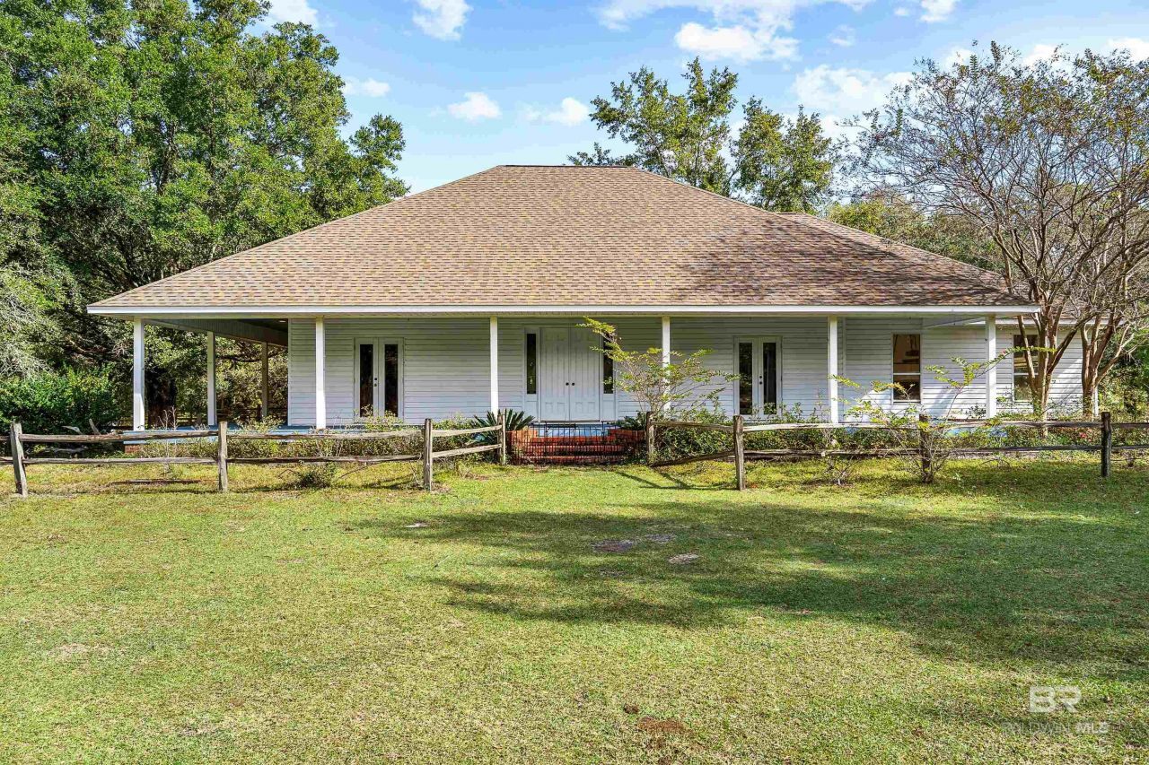 The best of country living with city convenience can be found at 22506 Doc McDuffie Road. Located just minutes from downtown Foley, this 15+ acre property offers easy access to both the Foley Beach Express and Highway 98, putting you close to OWA, Tanger Outlets, and an array of shopping, dining, and entertainment options, while also being just a short drive to the beach. This beautiful farm property provides space, privacy, and endless potential. With open pastures, majestic oaks, barns, and a tranquil pond, it's perfectly suited for horses, livestock, or simply enjoying the peaceful setting. The 3-bedroom, 3-bathroom home offers 2,020 square feet of living space with an 8-foot wraparound porch on three sides, creating the ideal spot to relax and take in the scenery. Inside, rich Brazilian cherrywood floors and solid wood doors add warmth and character throughout. The foyer welcomes you with marble flooring and opens to a spacious living room with a soaring vaulted ceiling, built-in shelving, and a gas fireplace framed by French doors that lead to the porch. The kitchen features slate floors, granite countertops and backsplash, a Thermador gas range, a pantry, and bar seating, while the formal dining room includes built-in bookcases and doors that open to the porch for easy indoor-outdoor entertaining. The primary suite also offers porch access and a large ensuite bath with slate floors, a custom stone vanity, and a jetted tub with a steam shower setup. The walk-in closet includes custom built-ins for organized storage. Two additional bedrooms share a full bathroom, and a third full bath is conveniently located near the laundry room with access to the attached double garage. With a horse barn and 15+ acres of land, this property offers exceptional flexibility. Whether you envision an equestrian estate, family farm, or private retreat, the possibilities are endless. Buyer to verify all information during due diligence.