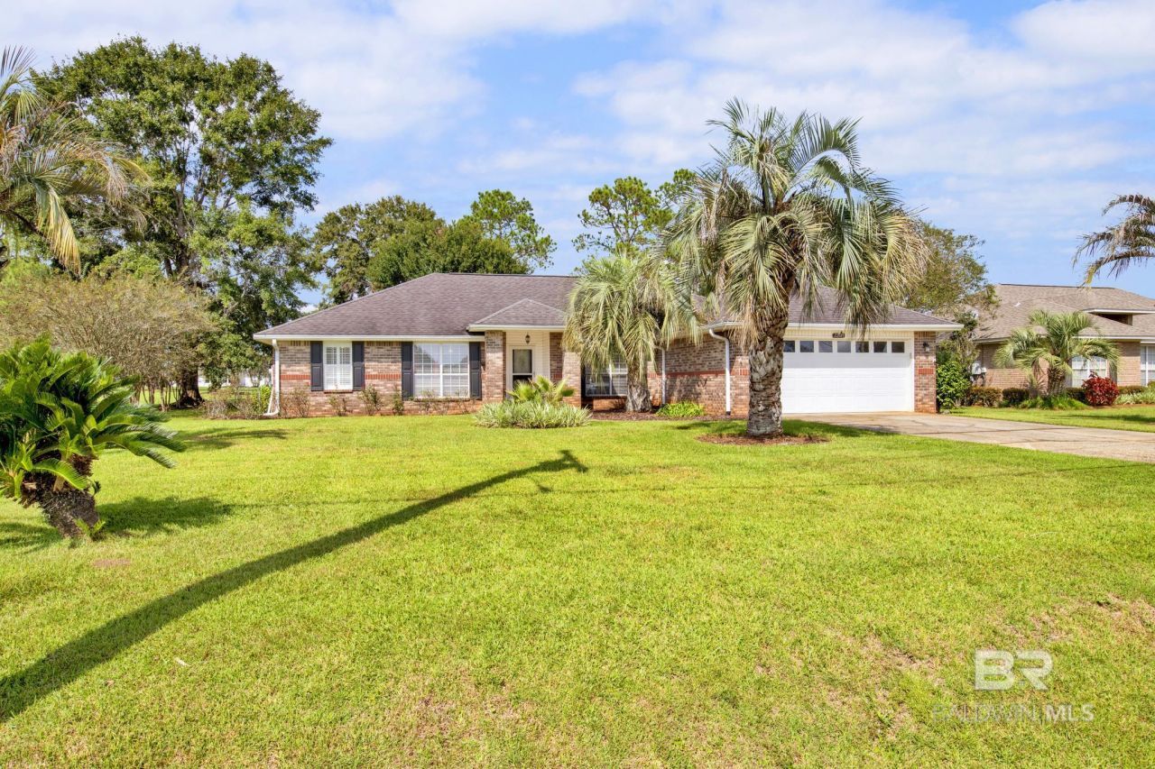4-bedroom 2-bath, one story brick home, in 2499 Sqft sits on .40 acres and is located on the 5th hole of the Glenlakes Golf Course. Updated Kitchen, almost new GE appliances, kitchen has granite counter tops. Large living room with Gas Fireplace. Plantation Shutters in the Living Room, Kitchen, Master Bedroom, and 2 of the 3 spare bedrooms. Formal dining room. Has separate home office. Split floor plan. Master bath has a jetted tub, separate shower, and two walk in closets. Sunroom overlooking the golf course is heated and cooled. Off the sunroom is a large screened in Lanai for your outdoor cooking and entertaining. Carpet in two spare bedrooms, LVP in the 3rd spare bedroom, tile throughout the rest of the house. Roof was installed 2013, HVAC was replaced with Carrier equipment September 2021, Sunroom HVAC in 2024, per the seller. Home comes with refrigerator w/ice maker, washer and dryer. Lakeview Estates is in the heart of the Glenlakes Golf Course community which offers 27 holes of golfing. This prime location puts you near Graham Creek Nature Preserve, OWA, Tanger Outlets, or a 20-minute trip on the Foley Beach Express takes you to the Wharf in Orange Beach, or to the white sand beaches. Buyer to verify all information during due diligence.