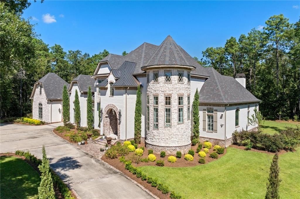 SELLER WILL ENTERTAIN OFFERS BETWEEN $1,999,900 - $2,499,900.Welcome to luxury living in Mobile's most exclusive gated community! Nestled on an acre corner lot, this custom-built French-style estate combines two lots, offering privacy, elegance, and modern amenities. With 6117 sq ft of living space, this energy-efficient home features advanced systems ensuring year-round comfort.The French-style turret, stone accents, copper roof details, and e-lute copper gas lanterns create castle-like charm, while solar floodlights enhance security. Step through a grand foyer with 22-ft ceilings, a custom iron door, and a spiral staircase with handmade iron railings. The main level boasts 12-ft ceilings, formal living and family rooms with imported cast stone fireplaces, reclaimed wood beams, and gothic brick arch accents.The gourmet kitchen features a mirrored Sub-Zero fridge, hammered stainless farmhouse sink, double ovens, six-burner gas stove, WiFi-enabled appliances, Milano honed quartz, and custom cabinetry. A butler's pantry with counters, cabinets, and fridge adds hosting convenience.The main floor master suite includes a stone fireplace and spa bath with steam shower, rainfall spout, body sprayers, and footed tub. A guest suite, plus a Tourette room with 18-ft ceilings and projector wiring, complete this level. Upstairs offers three bedrooms (one en-suite), a game room, and charming fandeliers.Energy efficiency continues with three Renaii tankless water heaters. A large laundry includes cabinetry, counters, and farmhouse sink. Hardwood oak floors and stone countertops elevate finishes throughout.Outdoor living includes a covered split-brick patio with full kitchen, bathroom access, and lush landscaping with 40+ fruit trees, well-fed sprinklers, and vibrant gardens. The estate also features a four-car garage, whole-house generator, and complete gutter system.Experience timeless elegance and modern comfort-schedule your private showing today in Mobile's most prestigious neighborhood!