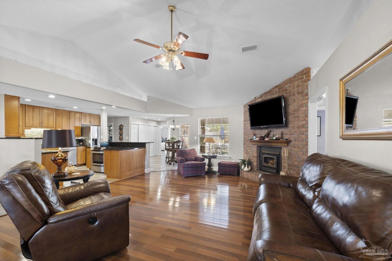 Large traditional home in a great location. As you enter you will note the beautiful hardwood floors, fireplace, vaulted ceiling, formal dining to your left, open concept kitchen with bar and breakfast nook all providing a great place to entertain friends and family. The kitchen offers a newer refrigerator, granite countertops, dishwasher, disposal, electric stove/oven, island, and oversized pantry. To the right there are two bedrooms and a full bathroom. The front bedroom offers two large closets and ample room for a bed, desk and crafts. The bathroom is spacious with large linen closet. The back bedroom features a nook and windows facing the back yard. The primary bedroom is huge with trey ceiling and ensuite featuring double vanity, garden tub, separate shower, and oversized closet. The fourth bedroom is in the back left corner of the house offering additional privacy. The laundry features a built-in ironing board and room for storage. The backyard is privacy fenced with a large partially covered patio, beverage bar complete with lighting and refrigerator plus a 24 foot above ground pool in a 30 x30 deck. Roof was replaced in 2020 with waterproof barrier, inside A/C and duct work replaced in 2020, and electrical panels replaced in 2025.