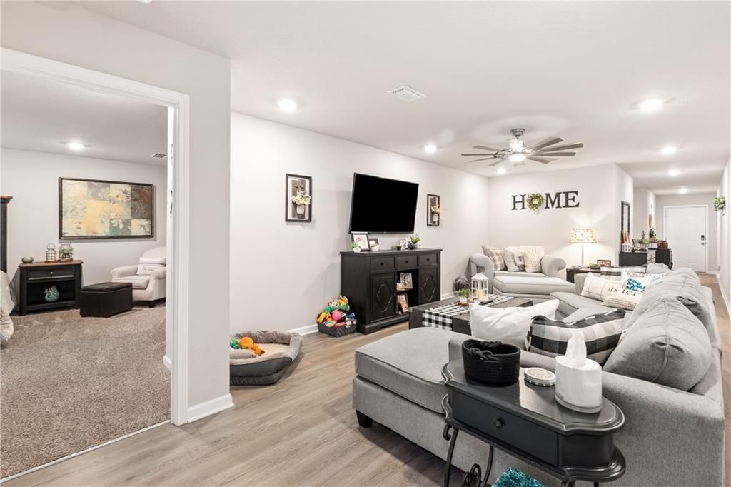 Welcome to Creekside Estates. Meet The Ryder! Step into style and comfort with The Ryder, a beautifully crafted 4-bedroom, 2-bathroom home featuring an open-concept layout that's perfect for entertaining. The heart of the home boasts a modern kitchen with sleek white and grey cabinetry, granite countertops, and a spacious island with an integrated sink. Stainless steel appliances complete the space, ready to handle all your culinary adventures. Interior Highlights: Elegant Mohawk luxury vinyl plank flooring throughout the main areas, cozy, plush carpeting in all bedrooms, stylish bathrooms with matching cabinetry and finishes, spacious two-car garage for added convenience, Smart Home Features. Modern Living Made Easy: Enjoy cutting-edge technology with your fully integrated Smart Home system, including Kwikset Smart Code front door lock Sky Bell video doorbell Eaton Z-Wave light switch for remote lighting control Honeywell T6 Pro Z-Wave thermostat, compatible with your smartphone or tablet. Amazon Echo and Echo Dot for seamless voice-command control of lights, locks, and temperature. Whole home security w/cameras on all sides. Entire home is wired for a generator. Color changing eave lighting/ Landscaping. Ceiling Fans Built to Last Gold Fortified Standards: Constructed to meet Gold Fortified Home standards, The Ryder is designed to help reduce your homeowner's insurance costs while providing enhanced durability and peace of mind. Balance of 10-year structural warranty conveys. Storage racks and cabinets in the garage do not convey. Kitchen appliances and the washer and dryer will remain.