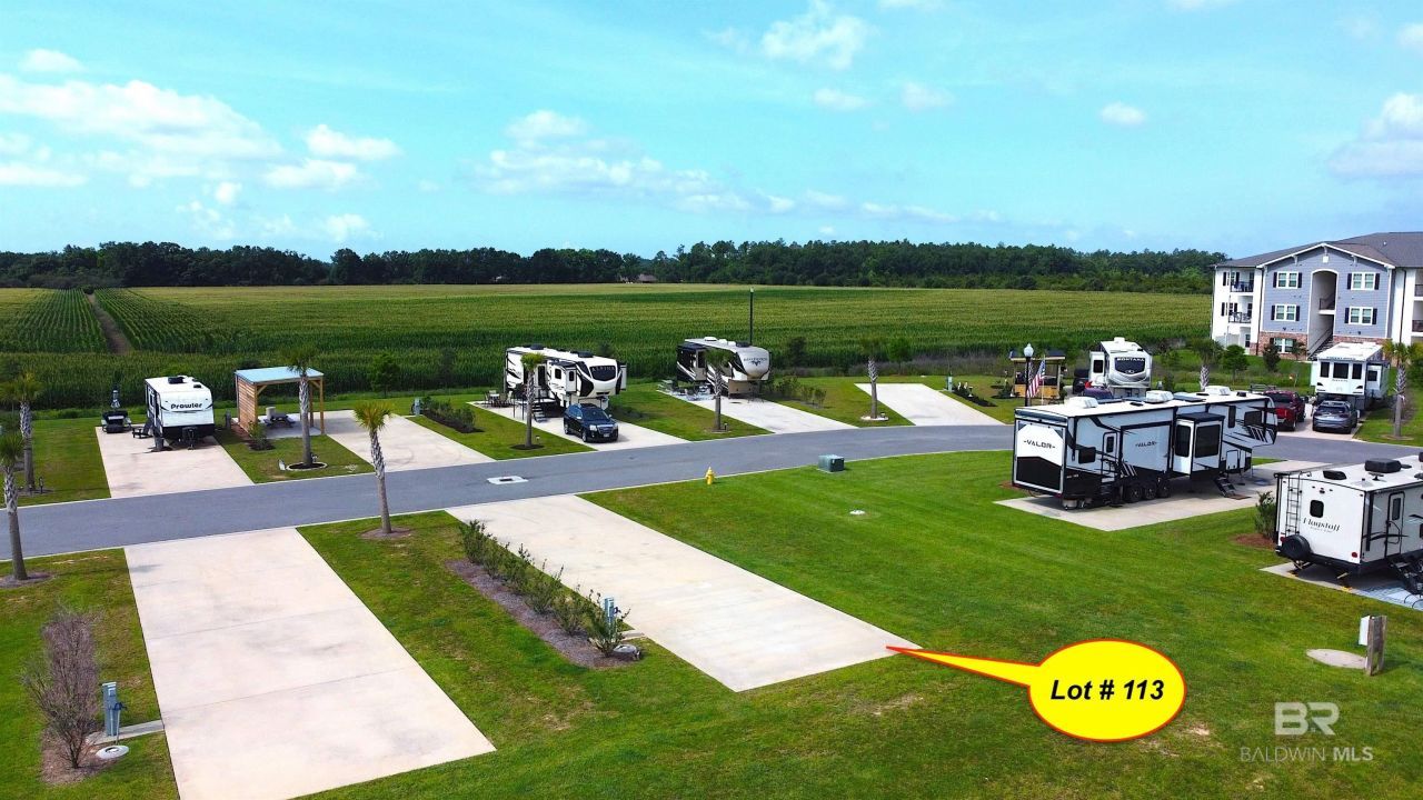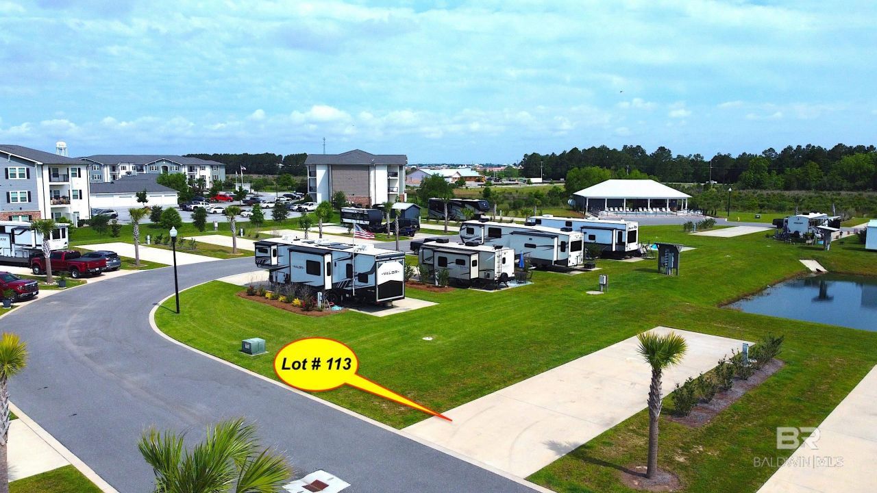 NEW PRICE! Lot 113 for sale in Grand Riviera RV Resort, Foley Al The location of this lot inside this gated park says it all! It's rare one of these highly sought after corner lots become available. This lot rest against the water's edge and a spacious green common area giving it a beautiful view and appealing setting. The resort is just 10 miles from the white sands of Gulf Shores & Orange Beach Al,Enjoy the heart of Foley's most active area! Resort highlights:? Prime Location: Enjoy easy access to OWA, Tanger Mall, Creekside Mini-Golf, and more, all within walking and biking distance.? Community Clubhouse: Large pavilion with pool, lake pier, fully equipped kitchen, picnic tables, 2 large screen TVs, and bathrooms with showers.? Park Amenities: 2 additional bath houses with pools, soccer field, dog park, playground, 3 pickleball courts. Investment Made Easy:? Rent your lot when you're away or set up an RV for Airbnb? Rental assistance program available (optional).? Increase the value by adding a gazebo or pavilion and a storage building to your lotAffordable HOA Dues ? $259/mo.Includes water, sewer, landscaping, cable, WIFI, and all park amenities! Buyer to verify all information during due diligence.
