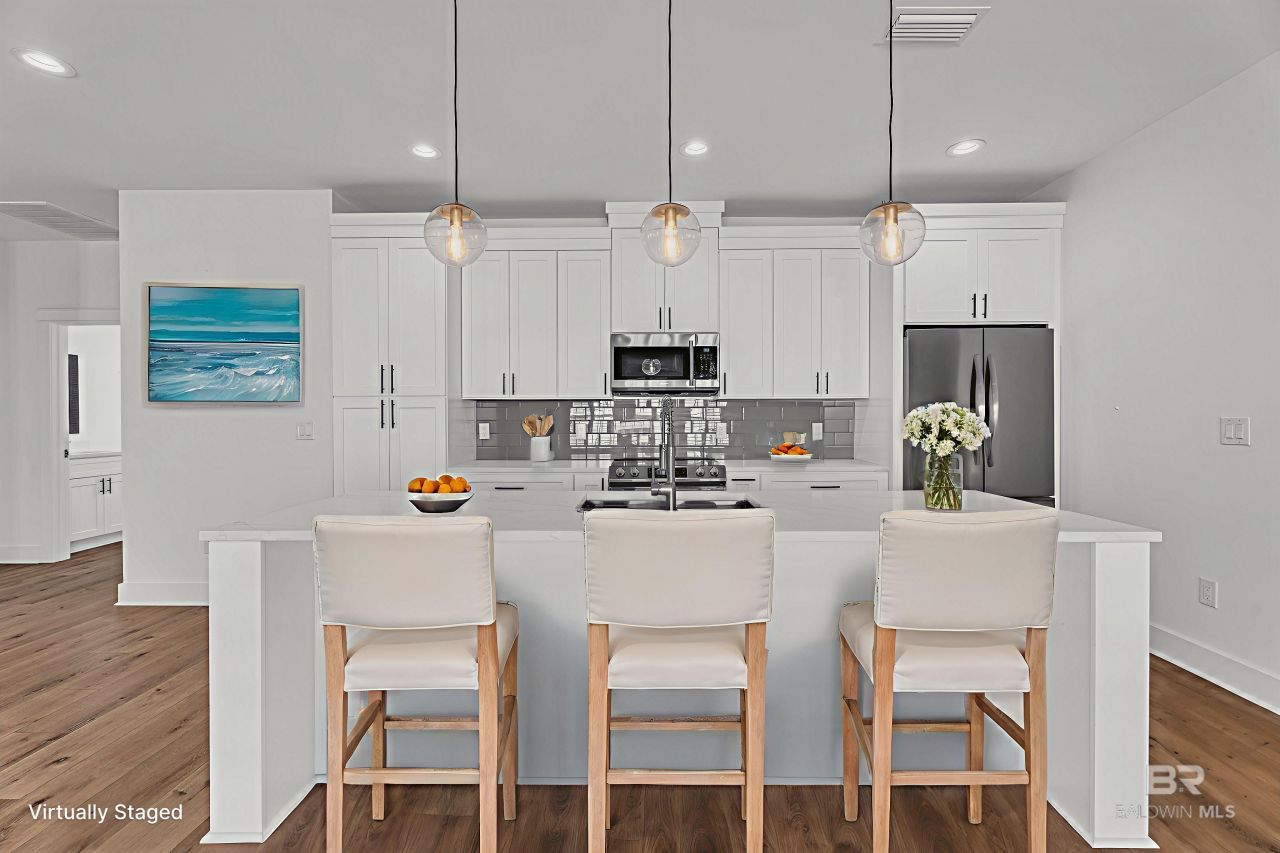 Experience the perfect blend of comfort, style & opportunity in this stunning 3BR/2BA GOLD FORTIFIED Beach-Style home in Foley, just 7 miles from the Gulf Shores beaches. Whether you're dreaming of a peaceful coastal retreat, a full-time residence, or a smart vacation rental, this property checks every box. Step inside to an inviting open floor plan with luxury vinyl flooring throughout?NO carpet! Recessed lighting & ceiling fans in every bedroom & the living room create a bright, breezy feel. The living room features built-in shelves, perfect for showcasing your treasures, plus a modern electric fireplace with a remote to change colors & add warmth or ambiance. The kitchen is a showstopper with a large island & farm sink, quartz countertops, tiled backsplash, & soft-close drawers. The dining room boasts a tray ceiling with wood beams, adding coastal charm. Retreat to the primary suite with a trey ceiling, a dual-entry walk-in closet, & an oversized tiled spa shower. Enjoy thoughtful touches like smooth walls & ceilings, wood-shelved closets, & Plantation Shutters, adding timeless elegance. Even the Laundry room has a touch of elegance, with a pocket door, window & quartz counter & sink, conveniently located off the garage. The Hardie Board exterior & metal roof adds durability & coastal appeal. Step out to the spacious screened-in porch, where peace & quiet abound, perfect for a cup of coffee or entertaining friends, as you look over lush green space with walking trails lined with crepe myrtles & magnolias. With SHORT-TERM RENTALS allowed, this home offers flexibility?generate income when you're away or savor the quiet coastal lifestyle year-round. Coastal living, smart investing, & everyday comfort all come together here. Located minutes to Gulf Shores & Orange Beach Entertainment, Restaurants & beaches, with easy access to hospitals, airports. TVs, refrig. W/D to stay. Buyer to verify all information during due diligence.