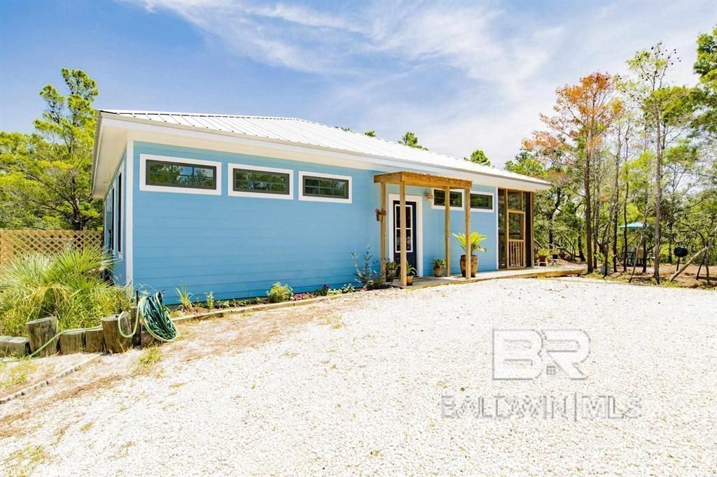 FORT MORGAN COTTAGE WITH ZERO STAIRS!!! Adorable Cottage in Cabana Beach! NEW LANDSCAPE WITH PALMS added May 2025 and brick paver back patio. Short-term rentals allowed! Perfectly situated between the Gulf of Mexico and Mobile Bay, Cabana Beach Estates is a quiet, secluded neighorhood off the beaten path. It's a perfect location where vacationers and full-time residents co-exist nicely enjoying the neighborhood private Gulf-Front Beach as well as the private neighbood park on Mobile Bay with fishing pier. This quaint very well-built Custom cottage comes fully furnished, has 3 bedrooms 2 bathrooms a large open floor plan living, dining, kitchen, and sitting area. So much craftmanship in the highwooden ceilings, tongue and groove walls, and hand-made bunk beds. You'll love the gas range in the kitchen and large picture window that overlooks the wooded back yard. Enjoy mornings on the screened-porch drinking your coffee and listening to the sounds of nature. The beach is a short walk or golf-cart ride away with car parking available as well. If you enjoy water sports, the private neighborhood fishing pier is just across the road from the community entrance. There's also a public boat launch right up the road. Cabana Beach residents also have the ability to purchase a non-resident membership to the Beach Club Resort next door where you'll find multiple pools, tennis courts, exercise facilities, restaurants and more. Whether you are looking to make Gulf Shores your full-time home , RETIREMENT HOME with NO STAIRS, or looking for a 2nd home investment property, I think you'll fall in love with this special home. Small annual HOA fee of $300 helps maintain the community beach and bay access and there is also an annual road maintenance assessment of $300. Buyer to verify all information during due diligence.